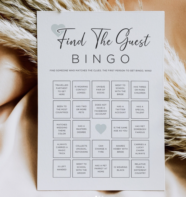 Create bingo cards with fun traits like “traveled abroad,” “loves coffee,” or “known the bride 10+ years.” Guests mingle and find someone who matches each box — perfect icebreaker and gets everyone talking instantly.