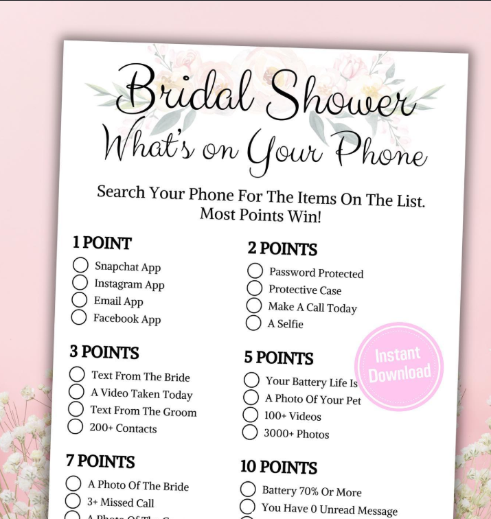 This “What’s on Your Phone” bridal shower game always gets everyone excited and laughing. Guests dig through their phones to find items on the list, and the one with the most points wins bragging rights (and maybe a cute prize too!).