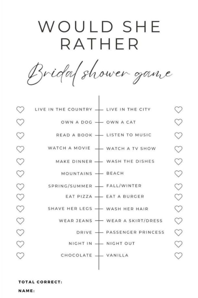 Put everyone to the test by guessing what the bride would choose in these fun “would she rather” scenarios. It’s the perfect mix of laughter, surprises, and sweet moments.