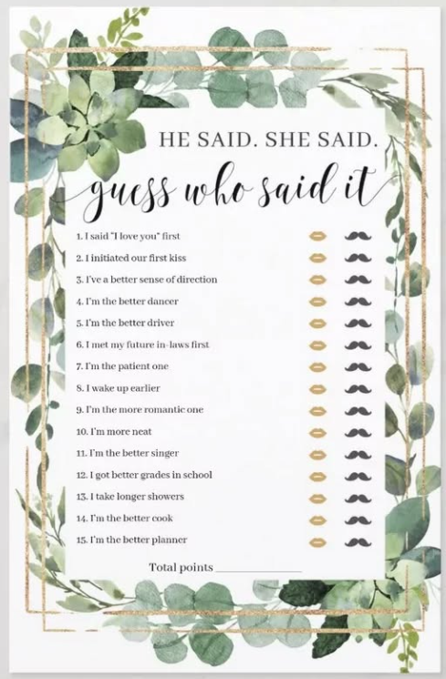 The “He Said She Said” bridal shower game is always a crowd favorite. Guests guess whether the bride or groom said each statement, leading to lots of laughs and a few surprising answers.