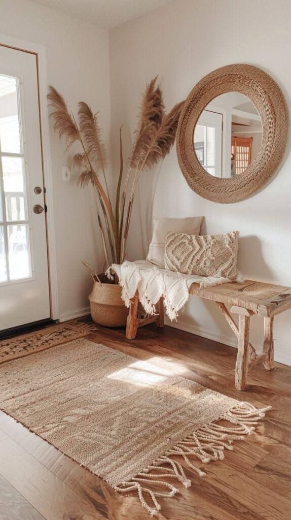 Neutral tones, woven materials, and soft textiles create a calming boho-inspired entryway. Pampas grass and a textured mirror bring in a stylish natural aesthetic.
