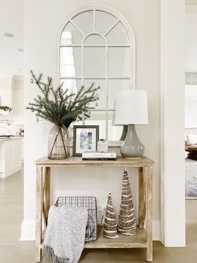 A wooden console paired with an oversized arched mirror instantly adds character to an entryway. Simple decor like a vase with greenery, a lamp, and small accents keeps the setup calm and balanced.