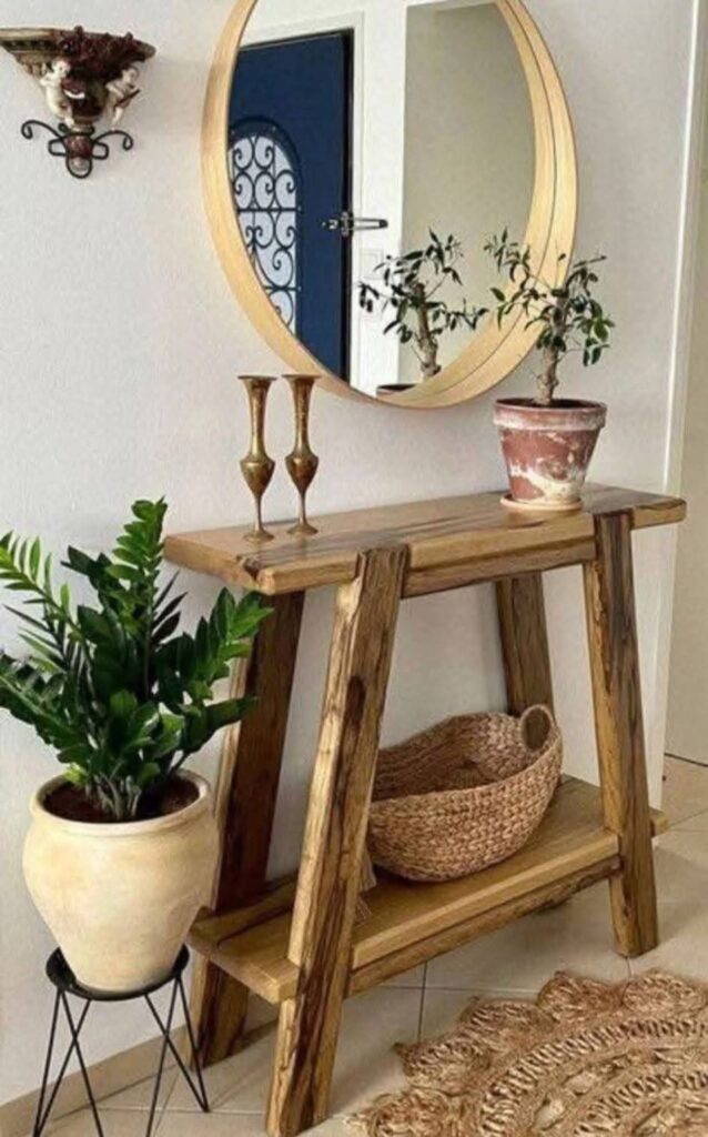 The raw wood texture of this console table adds warmth and organic charm. Paired with plants and simple metal accents, it creates a relaxed and earthy entryway look.