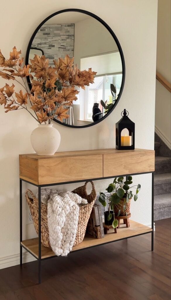 A simple wooden console with a round mirror keeps the entryway clean and uncluttered. Seasonal elements like autumn leaves or candles make it easy to refresh the decor throughout the year.