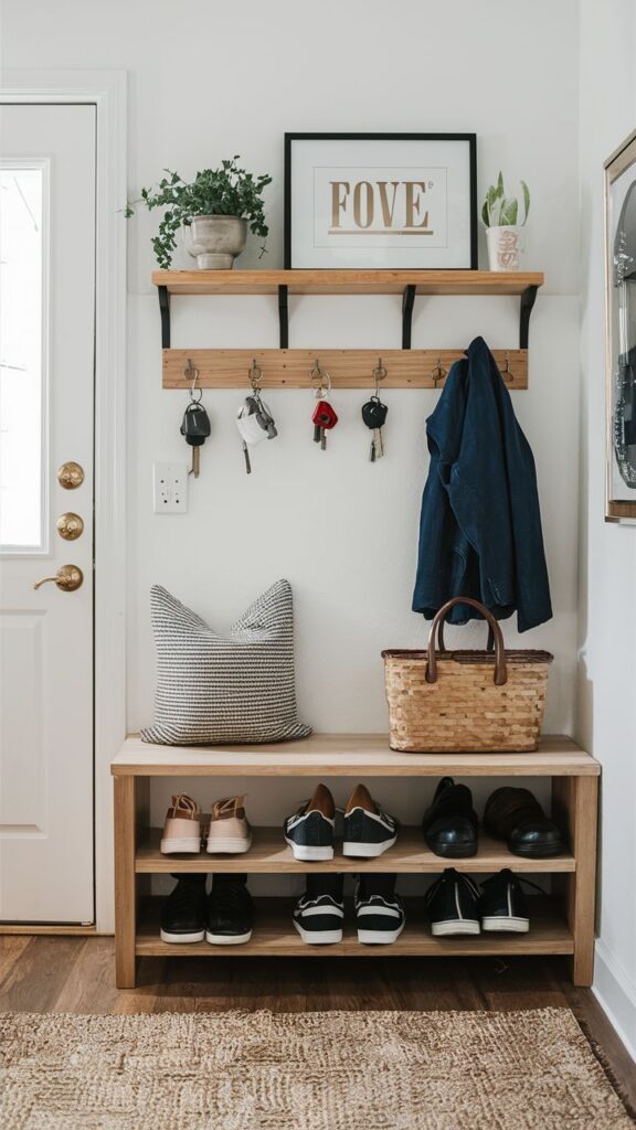 Combining a bench, hooks, and a floating shelf creates a smart entryway storage solution. Shoes stay organized below while keys and everyday essentials remain easy to grab.