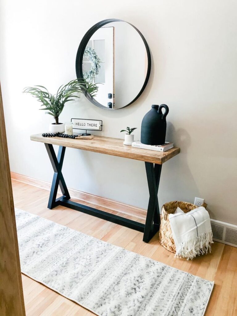 A slim console table works perfectly in small entryways or narrow hallways. The round mirror above it reflects light and visually expands the space.