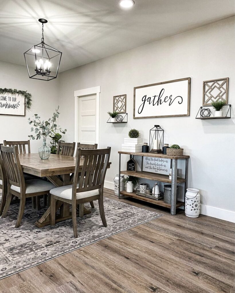 The “gather” wall art instantly sets the tone for cozy meals and conversations.