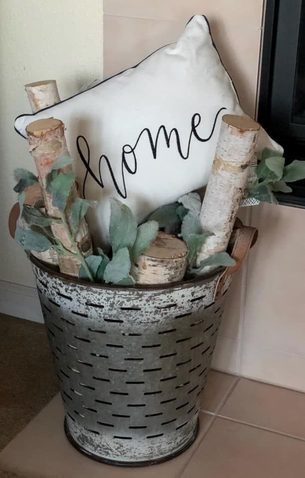 A simple metal bucket with wood logs and greenery brings in that raw farmhouse charm.