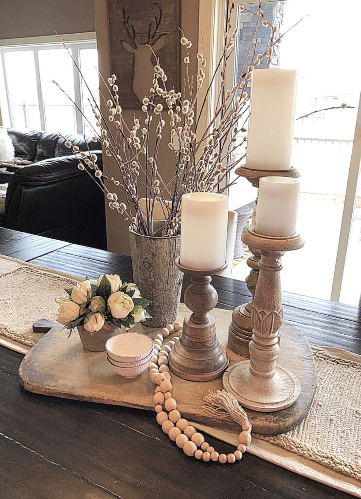 Candles, wood trays, and soft florals create a calm, cozy centerpiece.