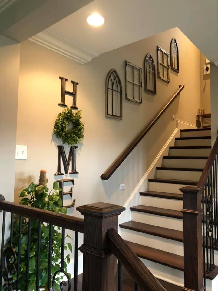 Mixing frames, letters, and greenery makes the staircase feel styled and intentional.