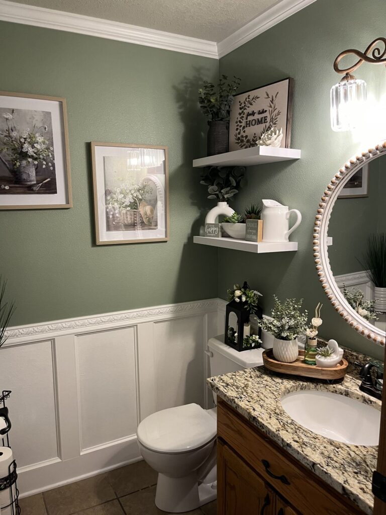 Even a small bathroom can feel warm and stylish with the right touches. The shelves, decor, and soft green tones make this space feel personal and thoughtfully put together.