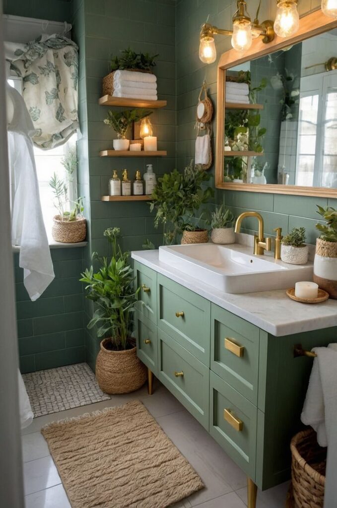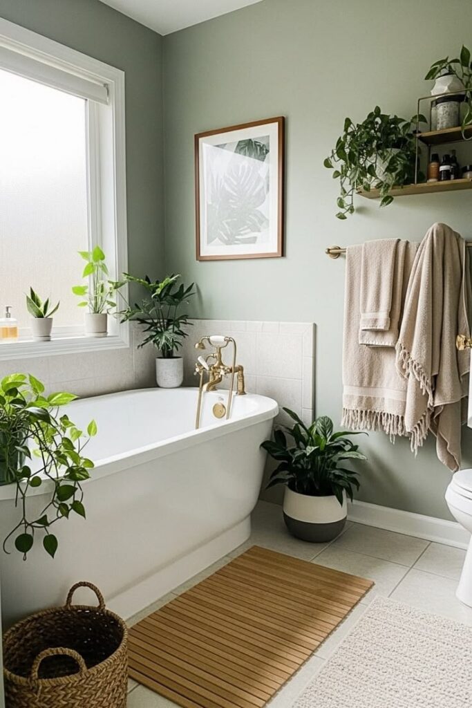 This bathroom feels like nature has taken over in the best possible way. The mix of greenery and soft green walls creates a peaceful space you will actually enjoy spending time in.