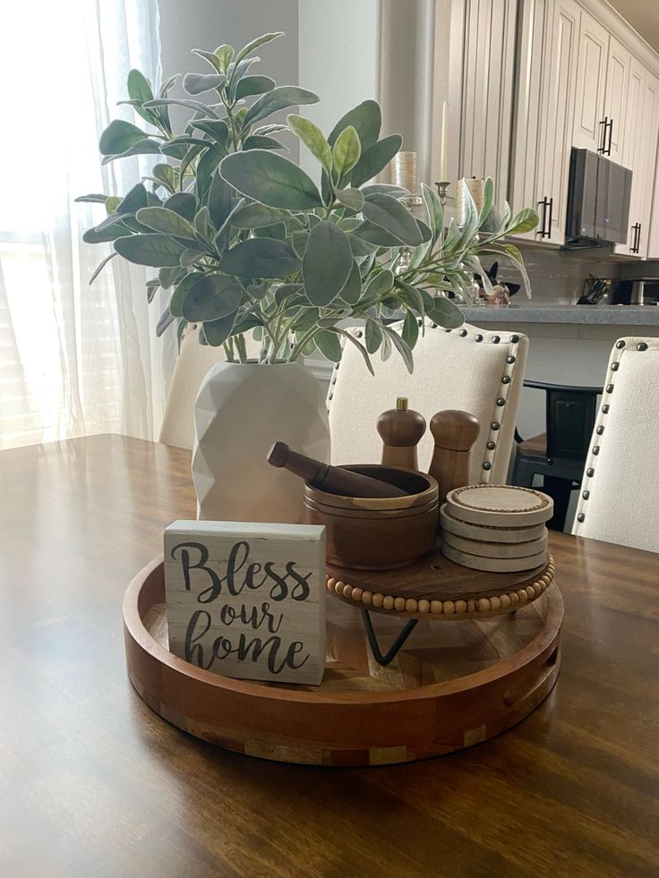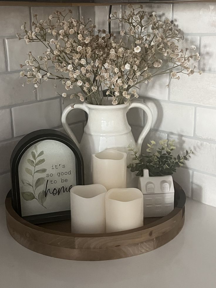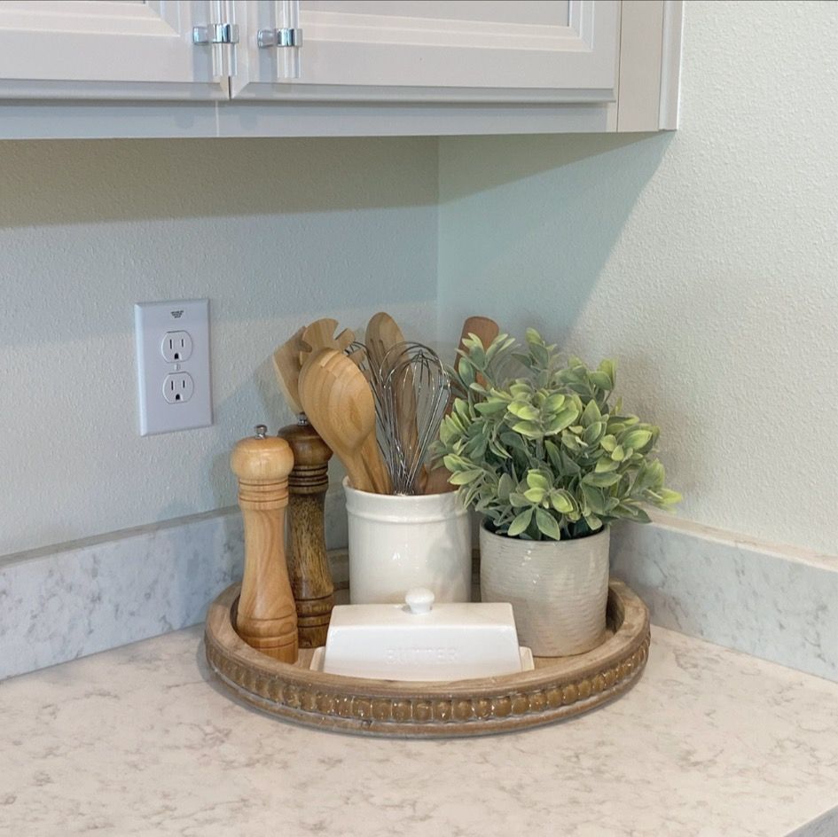 Using a round wooden tray helps group small decor items neatly on the counter. Plants, coasters, and small kitchen accents create a cozy farmhouse-inspired look.