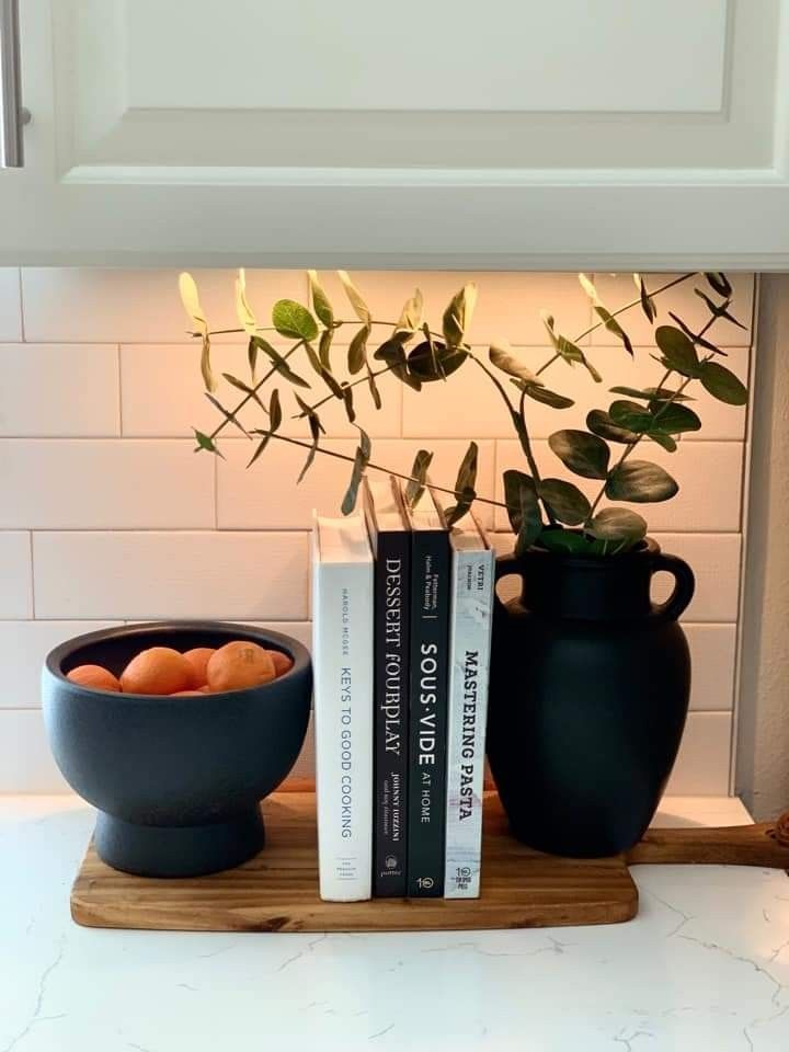 1. Minimal Kitchen Counter Styling with Cookbooks
