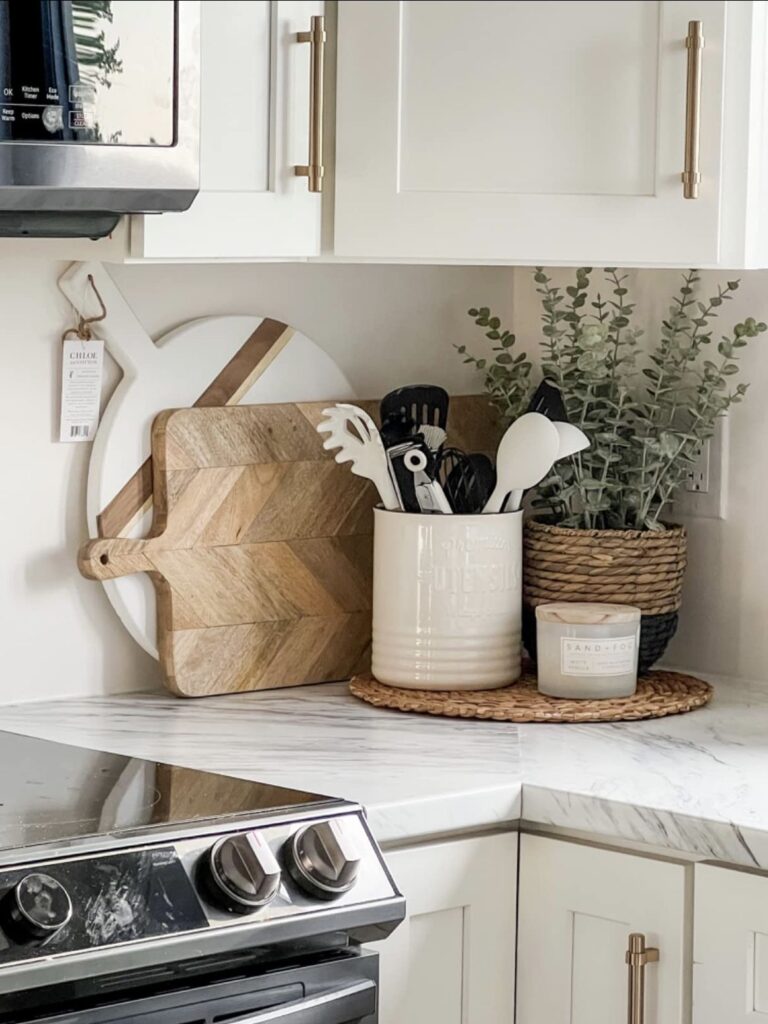 Leaning wooden cutting boards against the backsplash adds warmth and texture. A utensil holder and plant complete the look while keeping tools easy to grab.