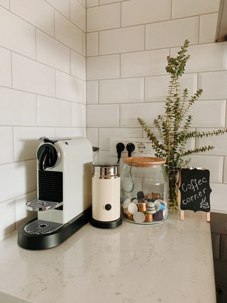 A small coffee machine paired with glass jars and greenery creates a neat coffee corner. The setup keeps the counter uncluttered while still feeling stylish.