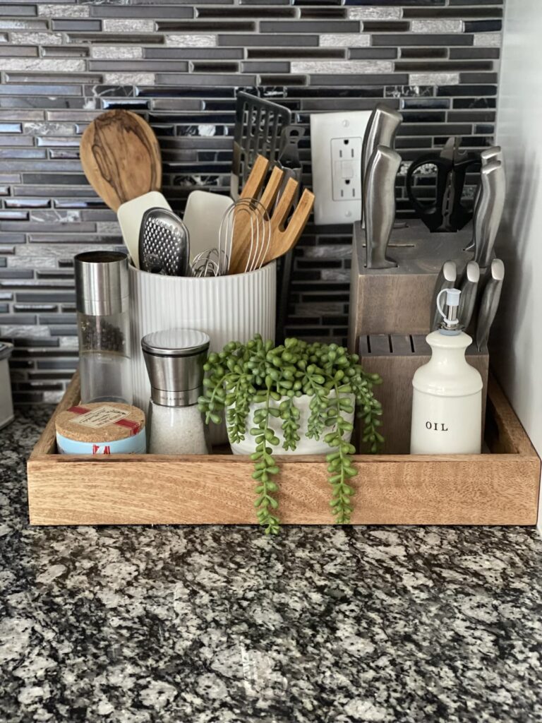 Grouping utensils, oil bottles, and small plants in a wooden tray keeps cooking tools close by. This setup combines functionality with a clean, modern look.