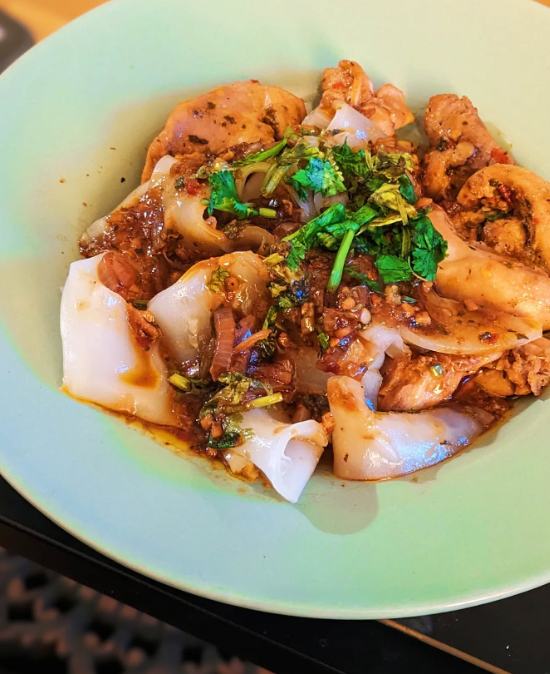 Wide, silky rice paper strips tossed in a bold, savory sauce with herbs and spices. This dish is messy in the best way — glossy, saucy, and deeply comforting.